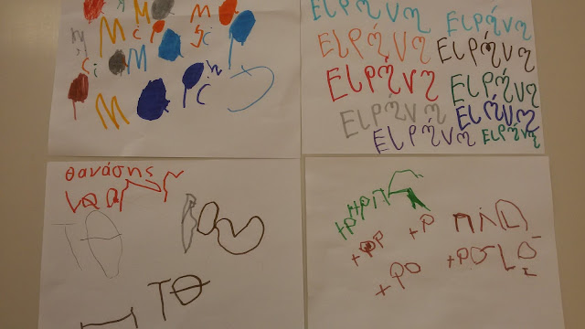 Πρώτη προσπάθεια των παιδιών (νηπίων-προνηπίων), να αντιγράψουν το όνομά τους όσες φορές και όπως μπορούν, από τα κινητά καρτελάκια τους.