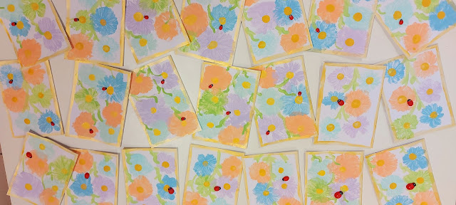 Τα παιδιά έφτιαξαν περίτεχνες ανοιξιάτικες κάρτες, βουτώντας σε τέμπερα φουσκωμένα σακουλάκια και δημιουργώντας όμορφα λουλούδια! Μετά κολλήσαμε πασχαλίτσες.